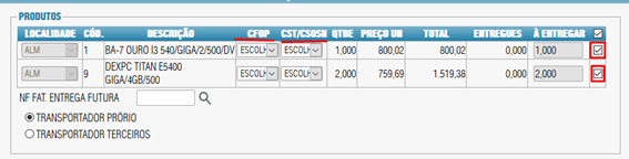 4 – Selecione os produtos que deseja que vá para nota escolha o cfop e csosn de cada produto.