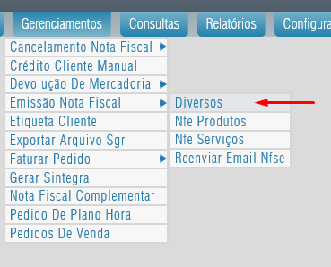 Gerenciamentos -> Emissão Nota Fiscal -> Diversos