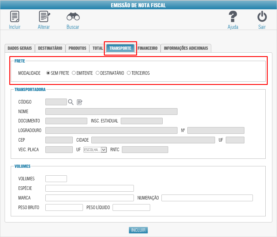 Escolha o Tipo de Frete, por padrão, vem o tipo Sem Frete selecionado. Caso selecione o tipo Terceiros, é necessário informar os dados da transportadora e as informações de Volumes