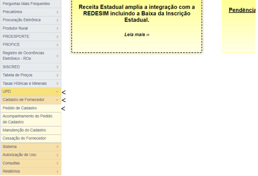 2. Após realizar o login, clique no menu UPD->Cadastro de Fornecedor->Pedido de Cadastro.